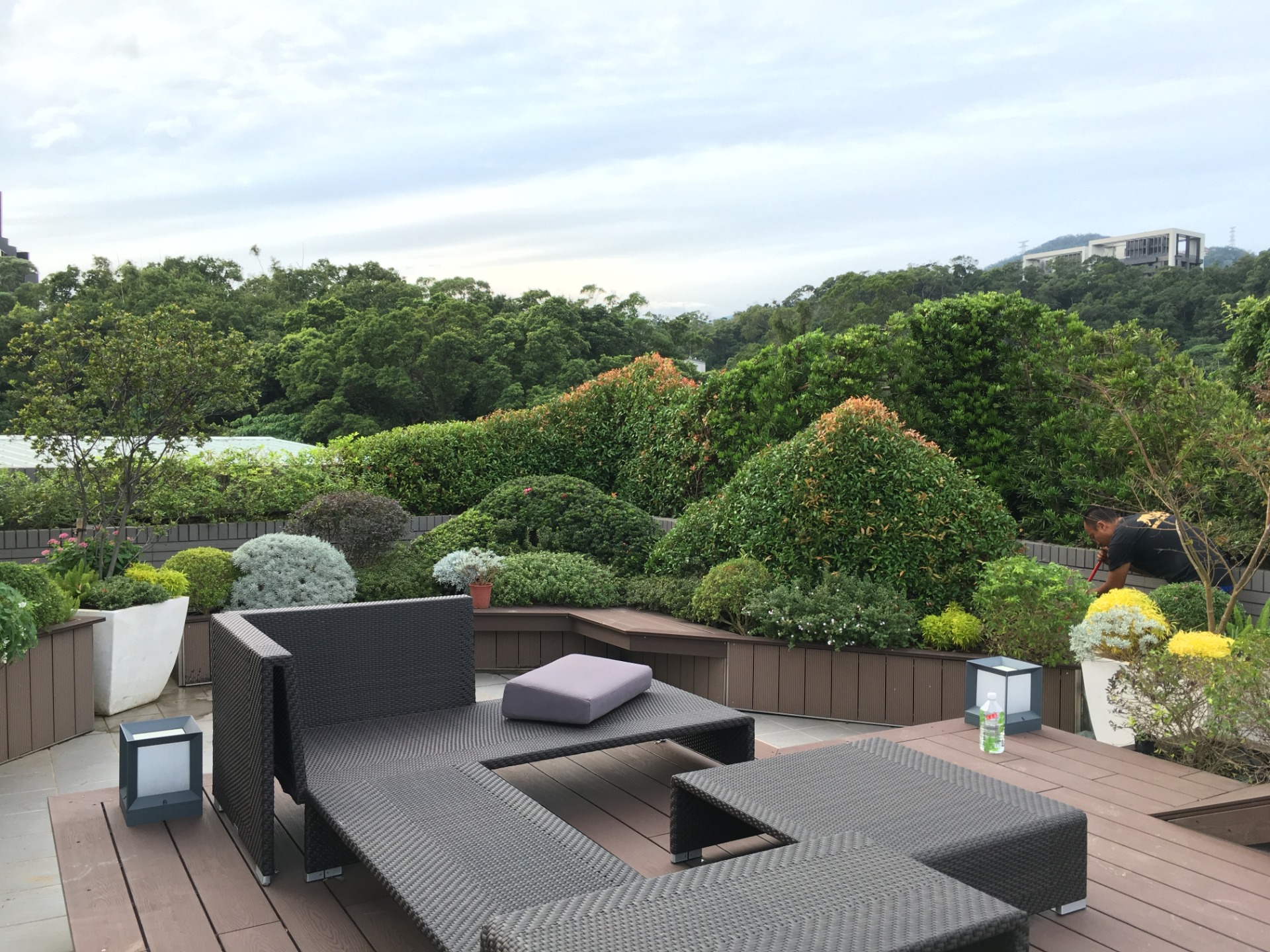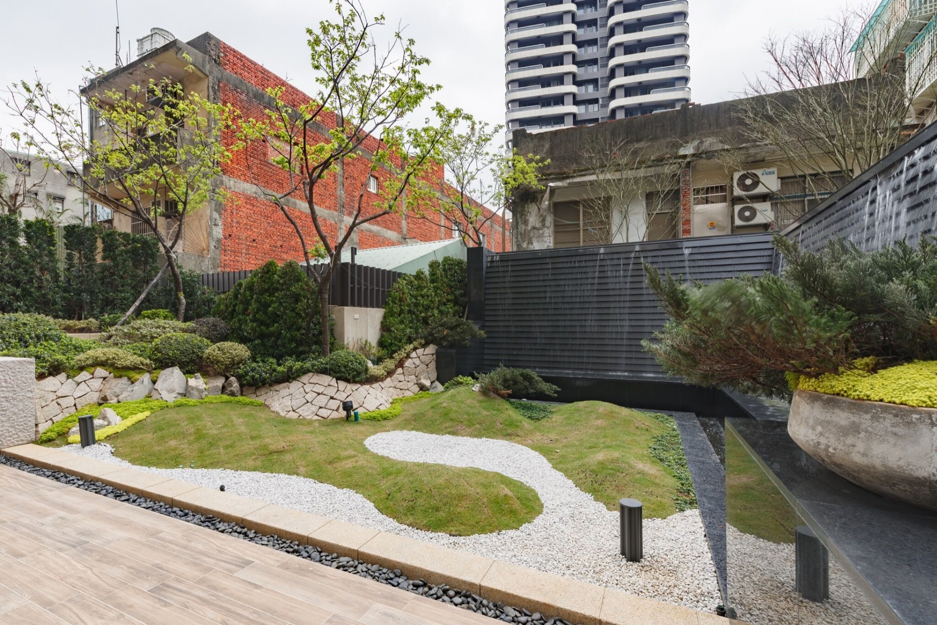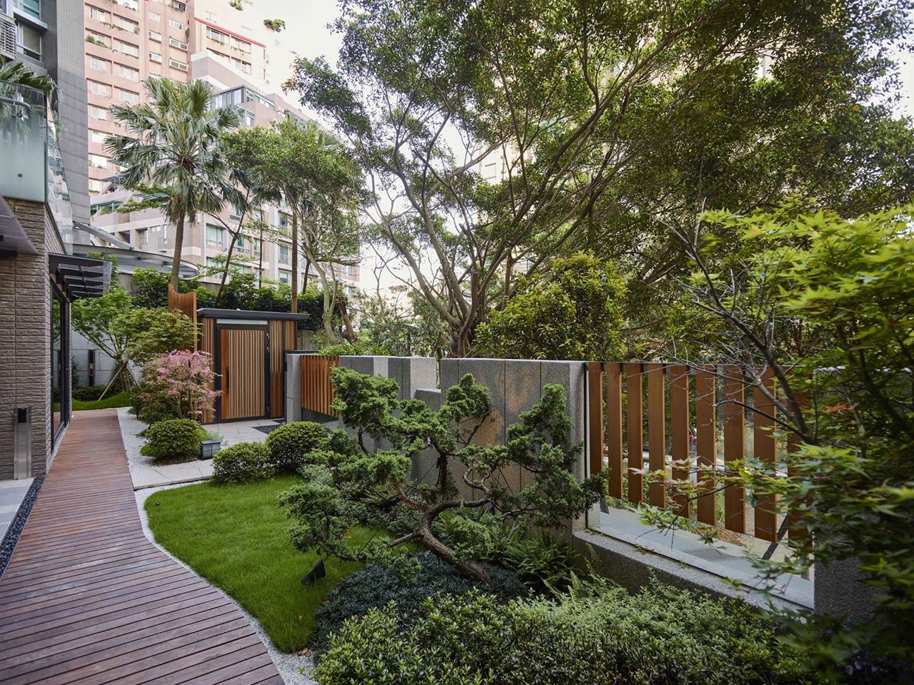 此為天母地標住宅之一戶私院造景,配合屋主的喜好以精緻日式風格設計融合周遭環境。