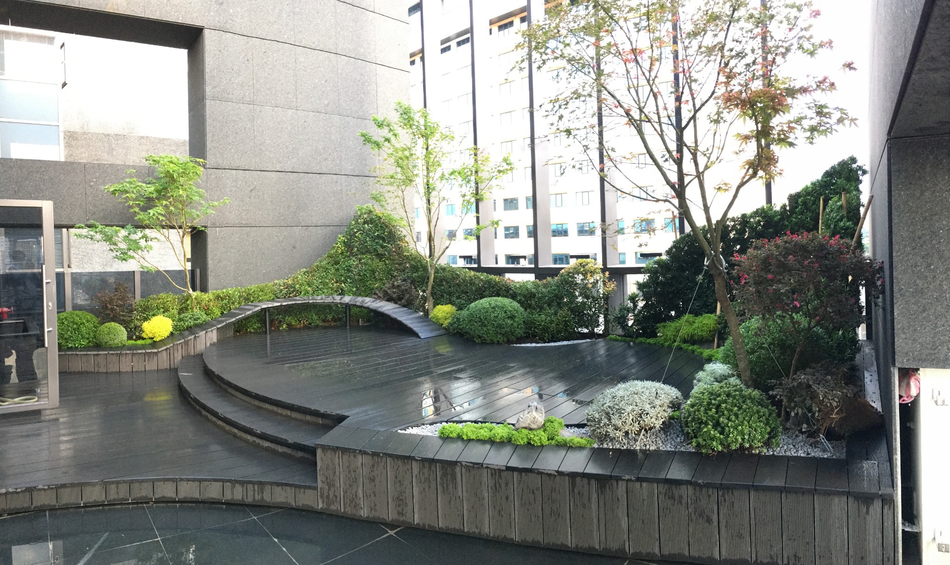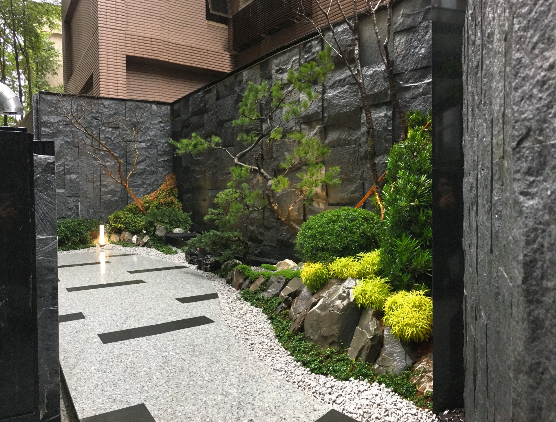 為一集合住宅大樓之景觀中庭,以自然日式的手法創造山林之意象融合於這個小型中庭,營造山水之氛圍。